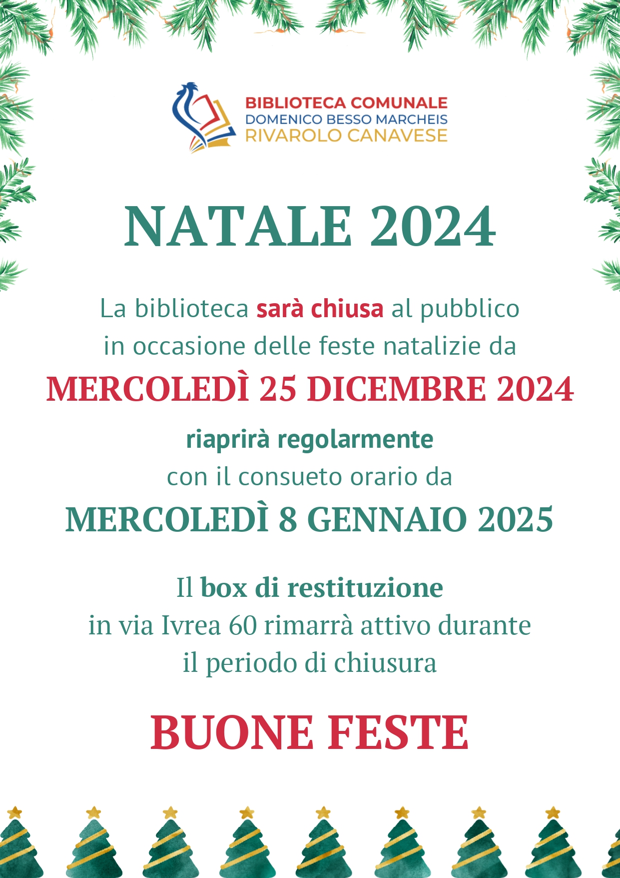La Biblioteca comunale "Domenico Besso Marcheis" sarà chiusa per festività dal 25 dicembre 2024 al 4 gennaio 2025 incluso. Riapertura mercoledì 8 gennaio 2025, con il consueto orario: