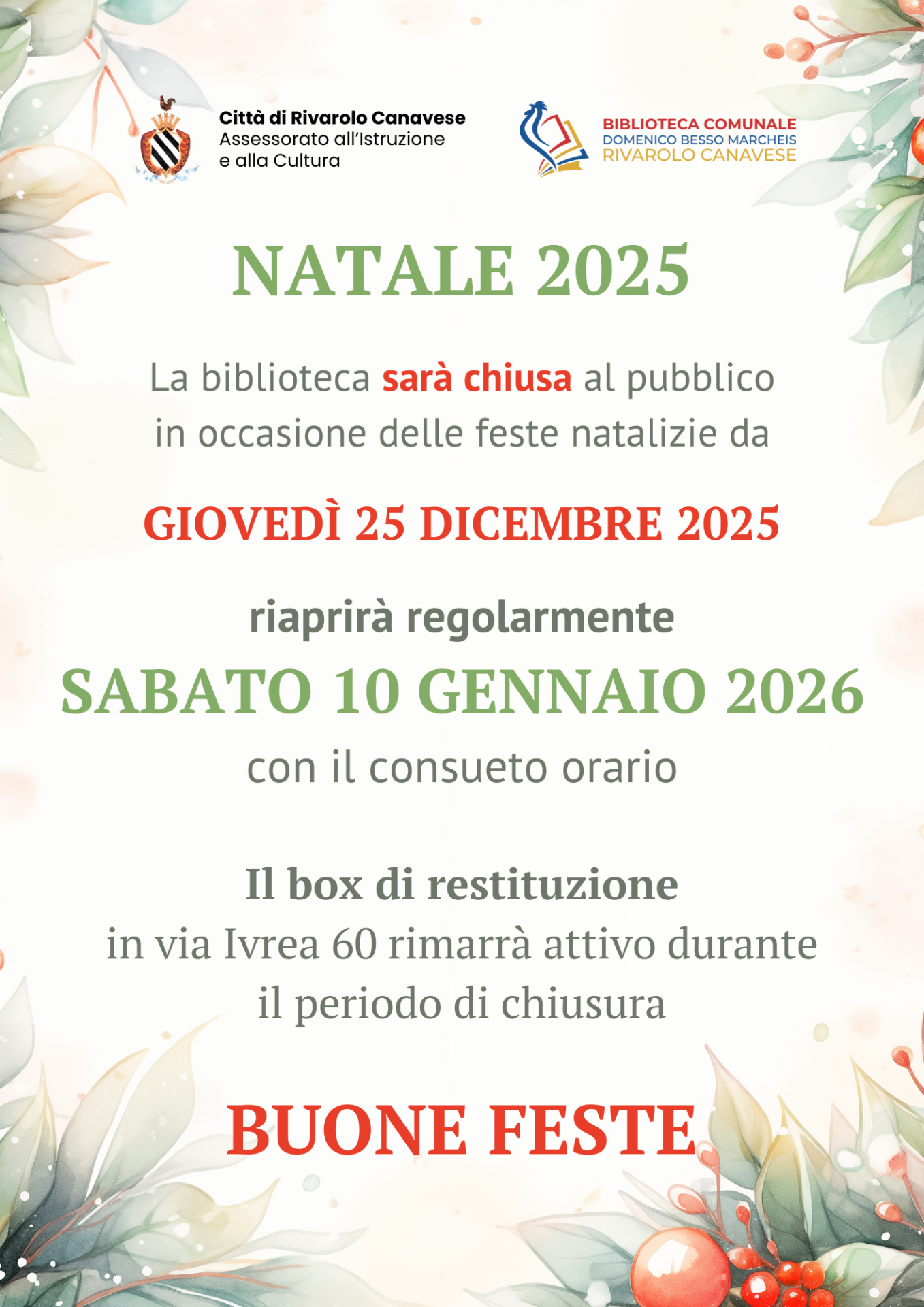 La Biblioteca comunale "Domenico Besso Marcheis" sarà aperta mercoledì 24 dicembre, con consueto orario 10-13.30 e 14.30-18, per poi chiudere durante le festività da Natale fino al 9 gennaio 2026.