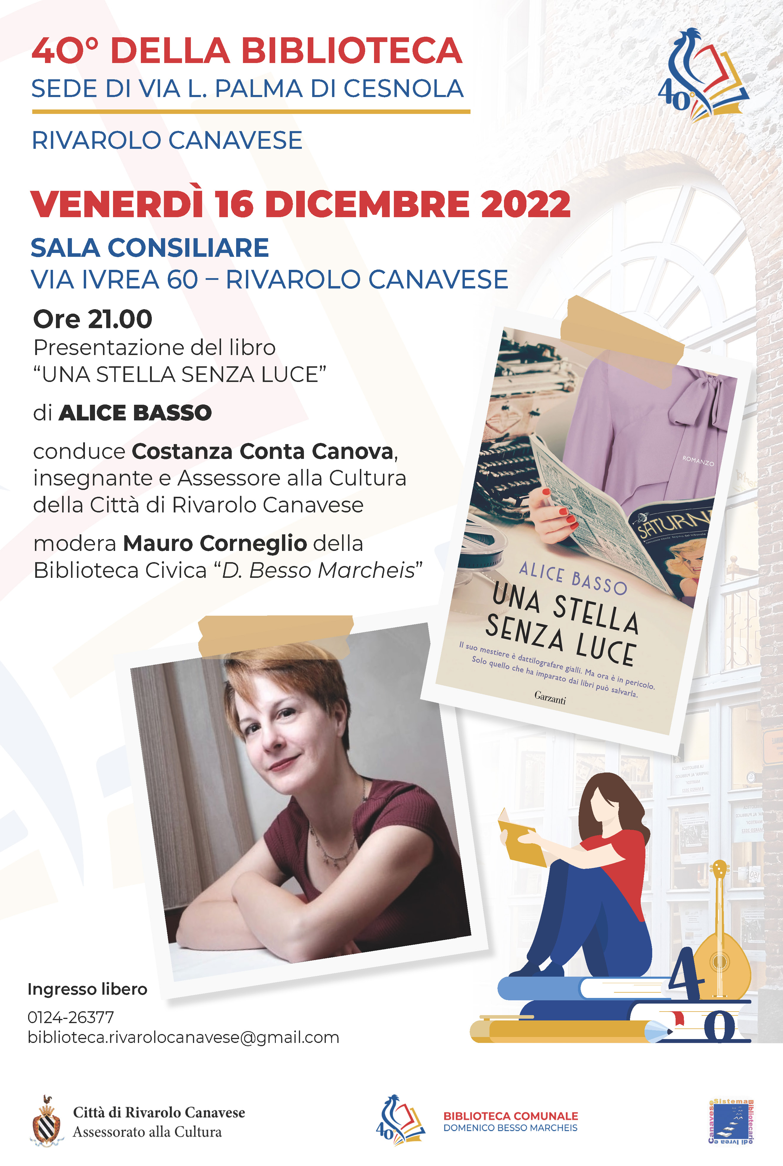 Alice Basso presenta a Rivarolo Canavese Una stella senza luce (Garzanti, 2022), nell'ambito dei festeggiamenti per il 40° anniversario della sede di Via Palma di Cesnola della Biblioteca "Domenico Besso Marcheis".