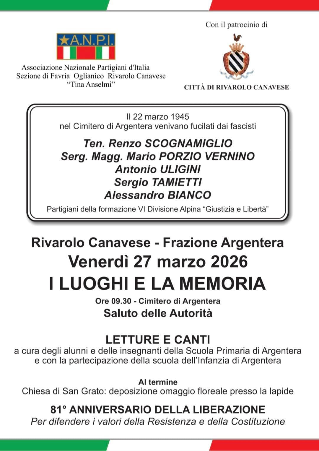 Venerdì 27 marzo 2026, alle ore 9:30 presso il Cimitero di Frazione Argentera, in occasione dell'81°anniversario della Liberazione, si terrà la commemorazione dell'eccidio dei Partigiani della VI Divisione alpina "Giustizia e Liberta", a cura dell'A.n.p.i. Sezione di Favria, Oglianico, Rivarolo Canavese, con il patrocinio della Città di Rivarolo Canavese.