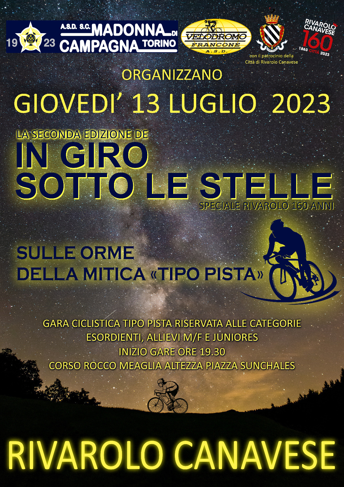 Giovedì 13 luglio 2023 le vie del centro di Rivarolo Canavese ospiteranno “In giro sotto le stelle”, circuito ciclistico notturno riservato alle Categorie FCI Esordienti, Allievi e Juniores.