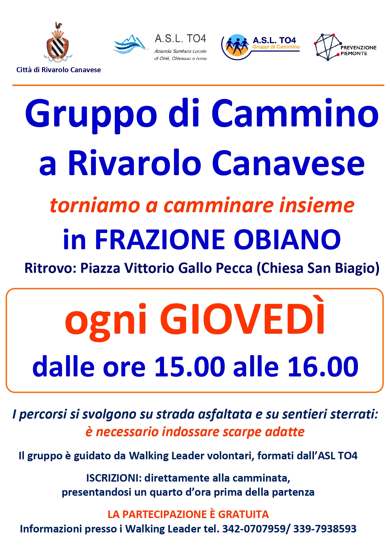 Ritrovo tutti i giovedì alle ore 15,00 in Frazione Obiano - Piazza Vittorio Gallo Pecca, presso la Chiesa di San Biagio. La camminata si svolge dalle 15.00 alle 16.00.