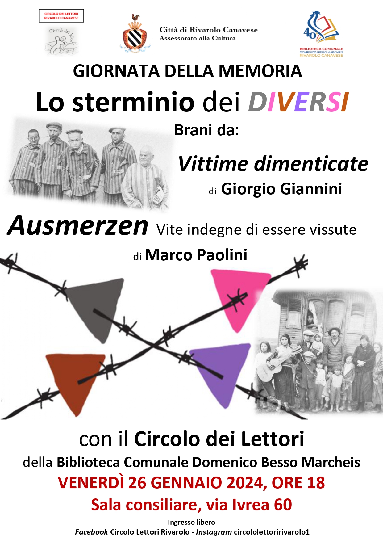 Venerdì 26 gennaio 2024 alle ore 18 presso la Sala Consiliare si terranno le Letture ad alta voce con il Circolo dei Lettori della Biblioteca Comunale Domenico Besso Marcheis, in occasione della ricorrenza del Giorno della Memoria.