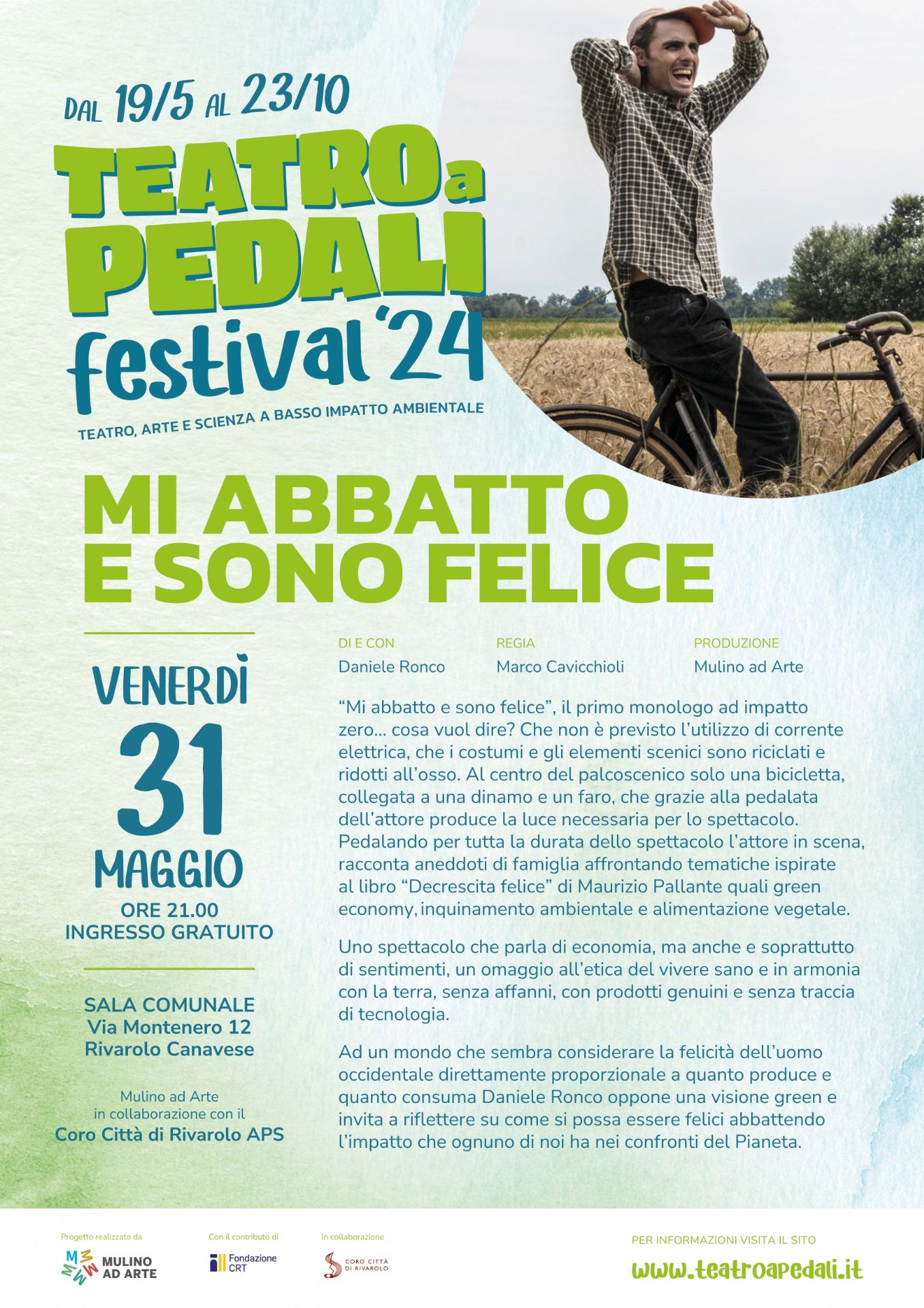“Mi abbatto e sono felice”, il primo monologo ad impatto zero in cui non è previsto l’utilizzo di corrente elettrica, con costumi ed elementi scenici riciclati. Al centro del palco solo una bicicletta, collegata a una dinamo e un faro, che grazie alla pedalata dell’attore produce la luce necessaria per lo spettacolo.