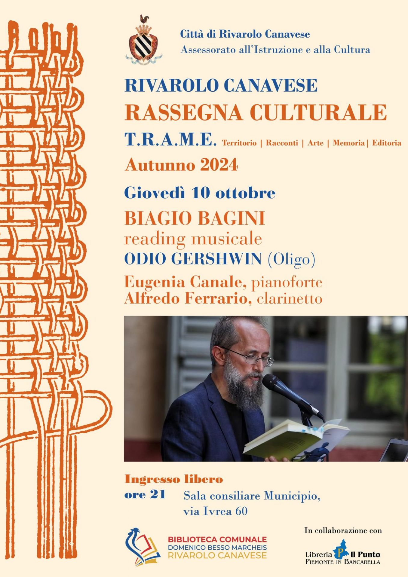 La serie di appuntamenti, presso la Sala consiliare in via Ivrea 60 con inizio alle 21, inizierà giovedì 10 ottobre con Biagio Bagini, autore di Odio Gershwin (Oligo editore, 2024). Insieme ad Eugenia Canale, al pianoforte, e al clarinettista Alfredo Ferrario, Bagini presenterà tra musiche e video, il romanzo che ripercorre la biografia di George Gershwin nel centenario della Rapsodia in Blu. Il moderno, la città, e poi il tennis: tratti comuni che spingono i protagonisti della narrazione, da Copland a Ravel, da Gershwin a Schoenberg a cimentarsi in una lunga partita musicale, tra Europa e America del primo trentennio del Novecento.