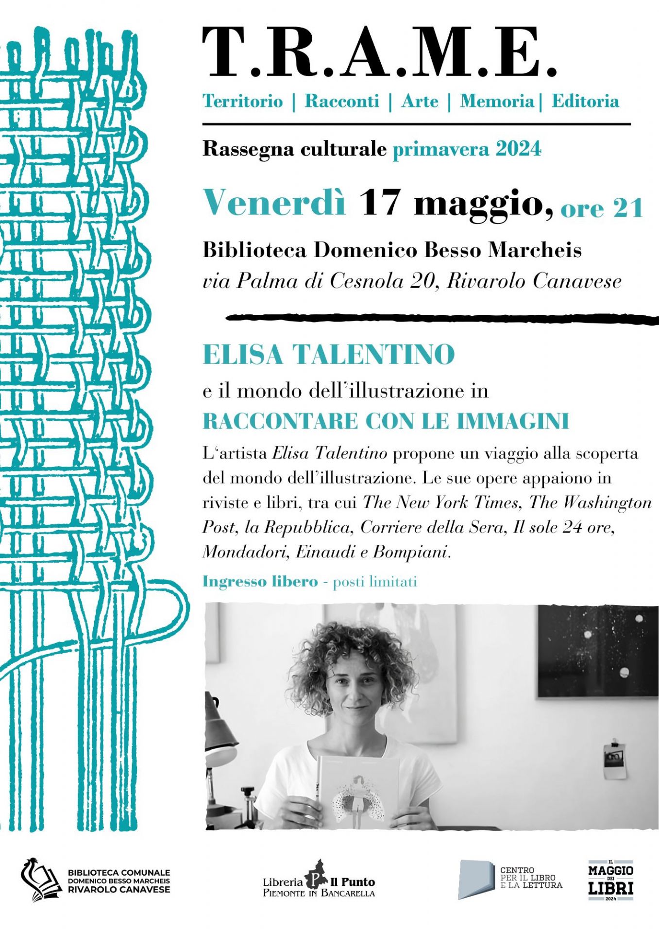 Venerdì 17 maggio alle ore 21 si terrà l'ultimo incontro della Rassegna Culturale T.R.A.M.E. presso la Biblioteca "Domenico Besso Marcheis" di Rivarolo Canavese (via Palma di Cesnola 20) con Elisa Talentino in "Raccontare con le immagini".