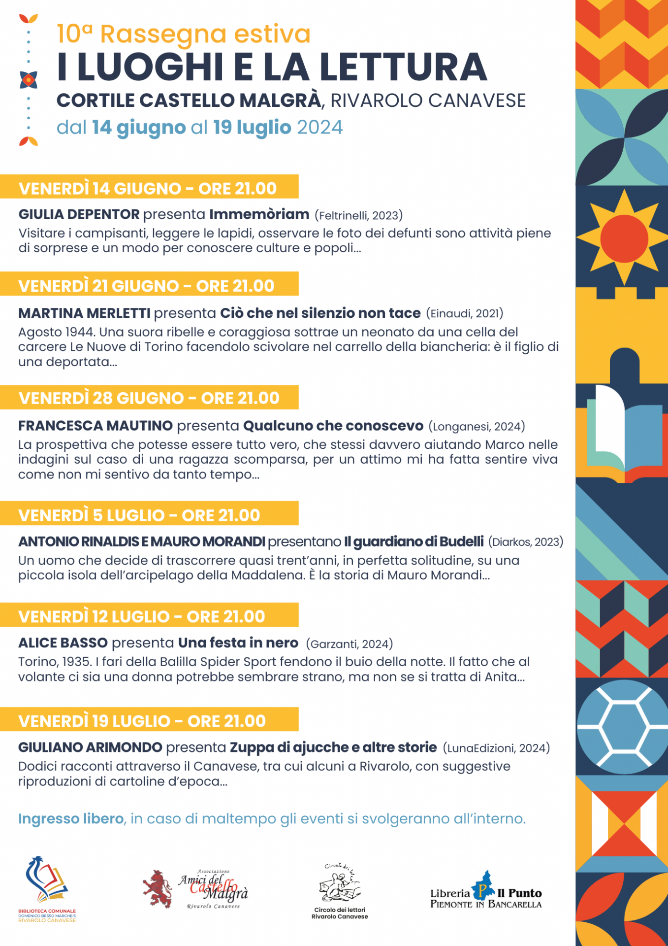 Il Castello Malgrà di Rivarolo Canavese ospita la decima edizione della rassegna letteraria estiva “I luoghi e la lettura” promossa dalla Biblioteca comunale “Domenico Besso Marcheis” in collaborazione con l’Associazione “Amici del Castello Malgrà” e la libreria Il Punto.