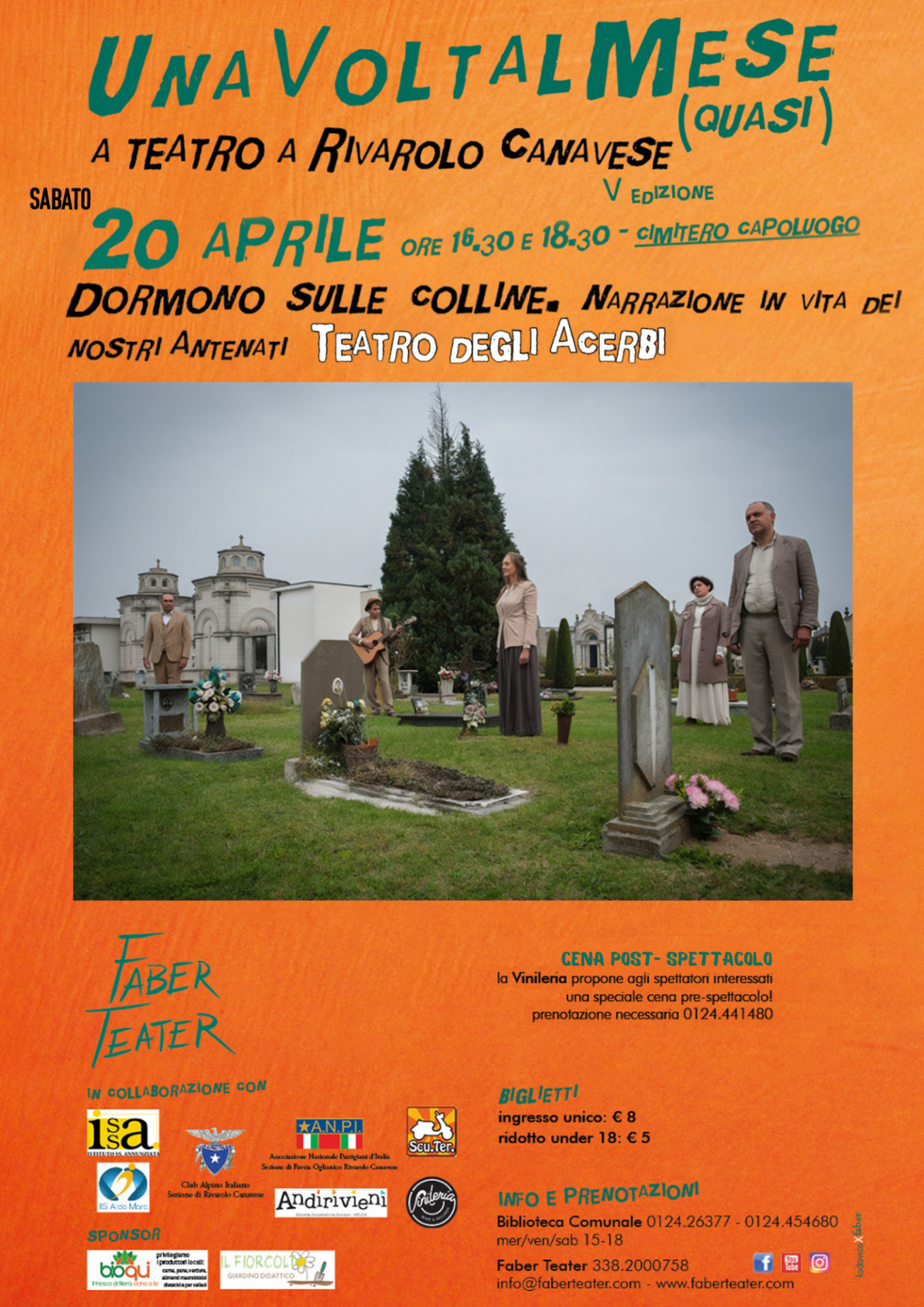 La rassegna teatrale Una voltalmese (quasi) che Faber Teater ha proposto con cadenza mensile dallo scorso dicembre per il pubblico di Rivarolo Canavese e dintorni, si conclude sabato 20 aprile 2024 con lo spettacolo Dormono sulle colline – narrazione in vita dei nostri antenati, proposto dalla compagnia Teatro degli Acerbi di Asti.