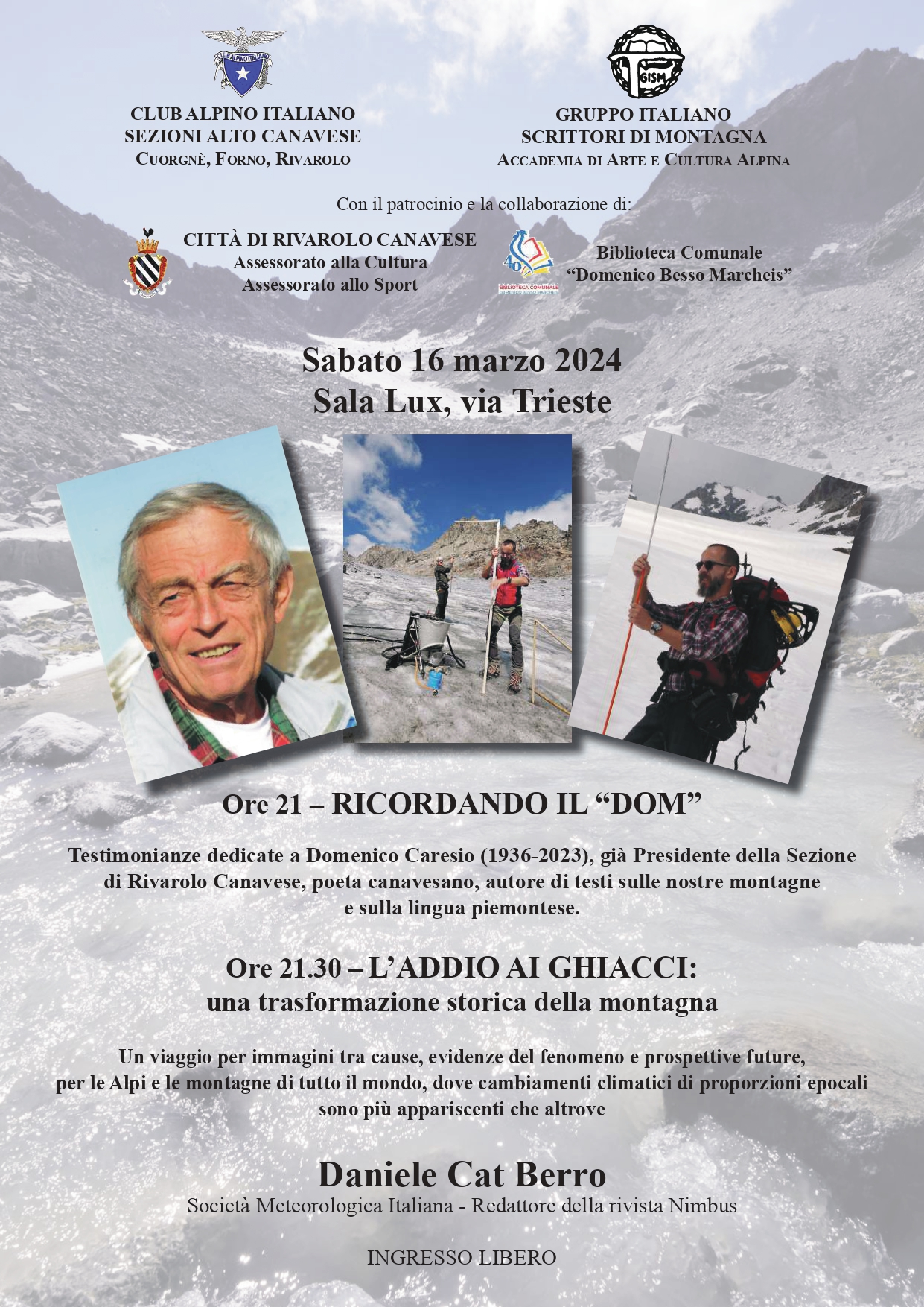 Le sezioni del Club Alpino Italiano dell’Alto Canavese (Cuorgnè, Forno, Rivarolo Canavese) e il G.I.S.M. (Gruppo Italiano Scrittori di Montagna) organizzano a Rivarolo Canavese, in data sabato 16 marzo 2024 presso la Sala " Lux - Giuseppe Bertinetti" - ingresso da via Trieste 43, una serata aperta alla libera e gratuita partecipazione di tutti gli interessati, articolata secondo il seguente programma: