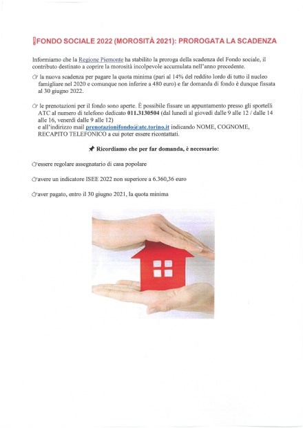 Informiamo che la Regione Piemonte ha stabilito la proroga della scadenza del fondo sociale, il contributo destinato alla morosità incolpevole accumulata l'anno precedente.