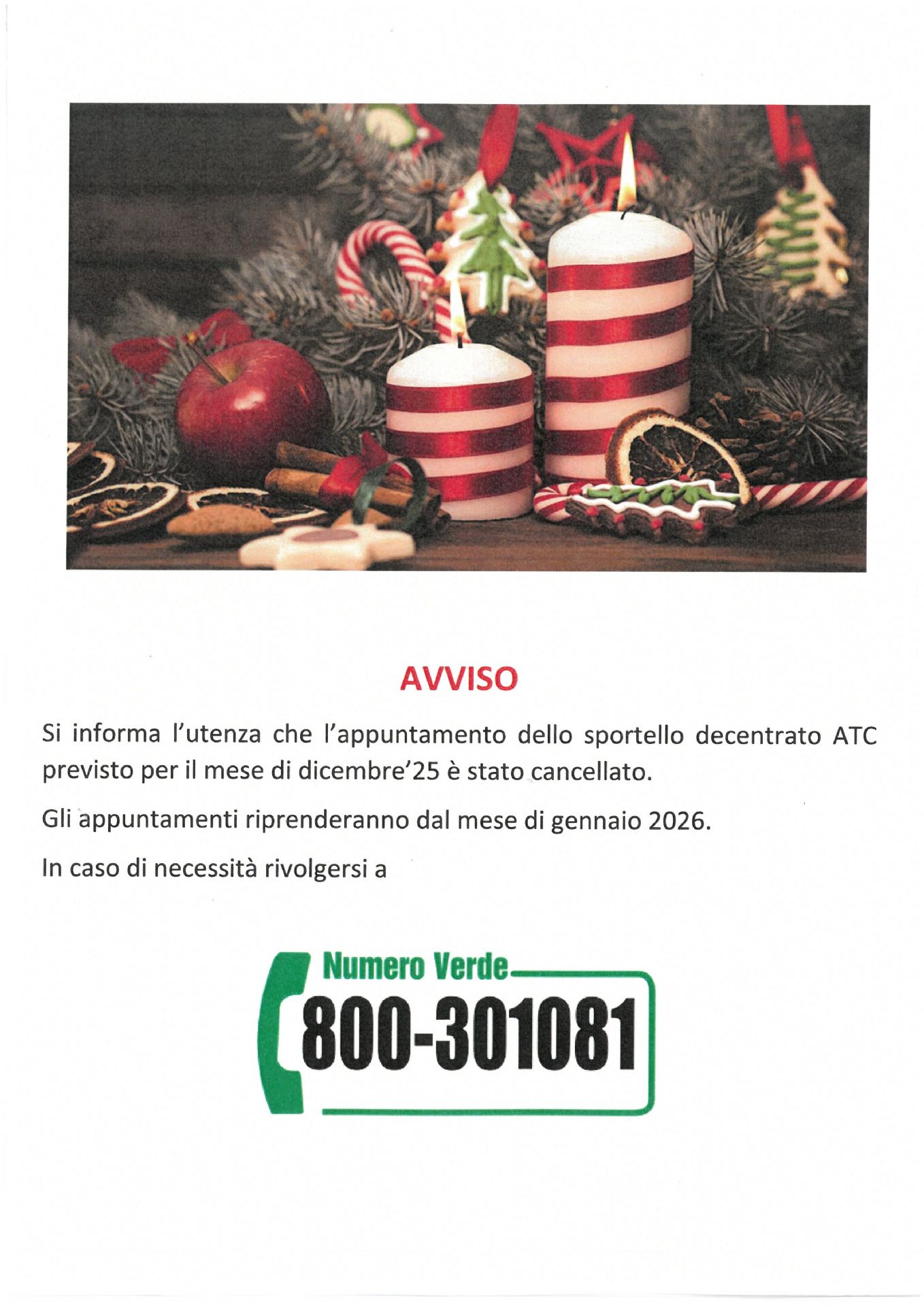 Si avvisa l'utenza che l'appuntamento dello Sportello decentrato ATC previsto per il mese di DICEMBRE '25 è stato CANCELLATO.