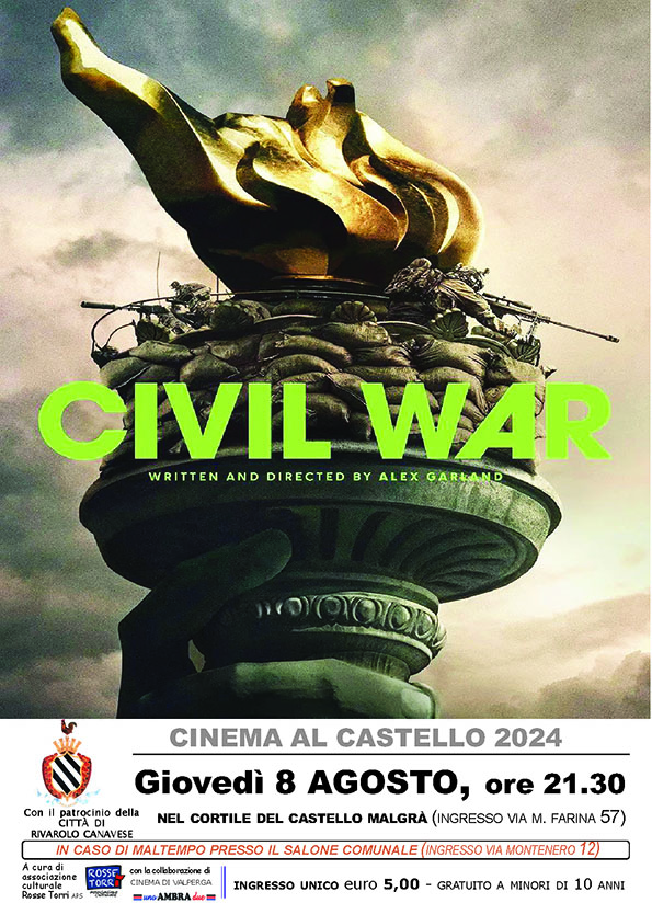 "Civil war" di Alex Garland (USA-UK, 2024, 109’): In un’America sull’orlo del collasso, attraverso terre desolate e città distrutte dall’esplosione di una guerra civile, un gruppo di reporter intraprende un viaggio in condizioni estreme, mettendo a rischio le proprie vite per raccontare la verità. Prende vita un on the road feroce, adrenalinico, che interroga sul ruolo delle immagini oggi. Un viaggio di ottocento miglia per intervistare un’ultima volta l’inquilino della Casa Bianca (il riferimento è a Trump?), che manipola l’informazione e fucila i giornalisti, oltre a massacrare i civili.