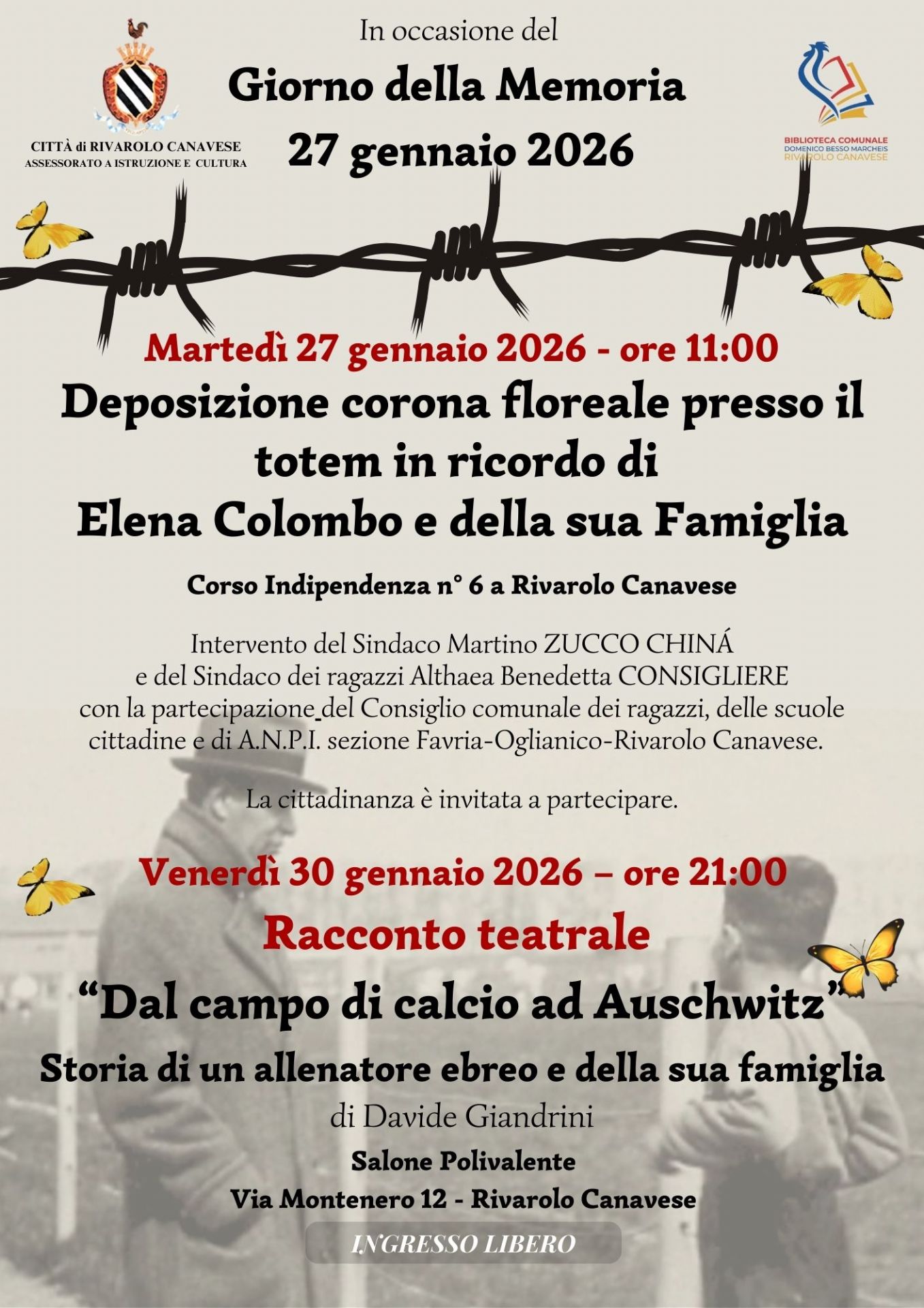 Eventi organizzati in occasione del Giorno della Memoria 2026 Martedì 27 gennaio ore 11:00: Deposizione corona floreale presso il totem in ricordo di Elena Colombo e della sua Famiglia, Corso Indipendenza n° 6 a Rivarolo Canavese; ...