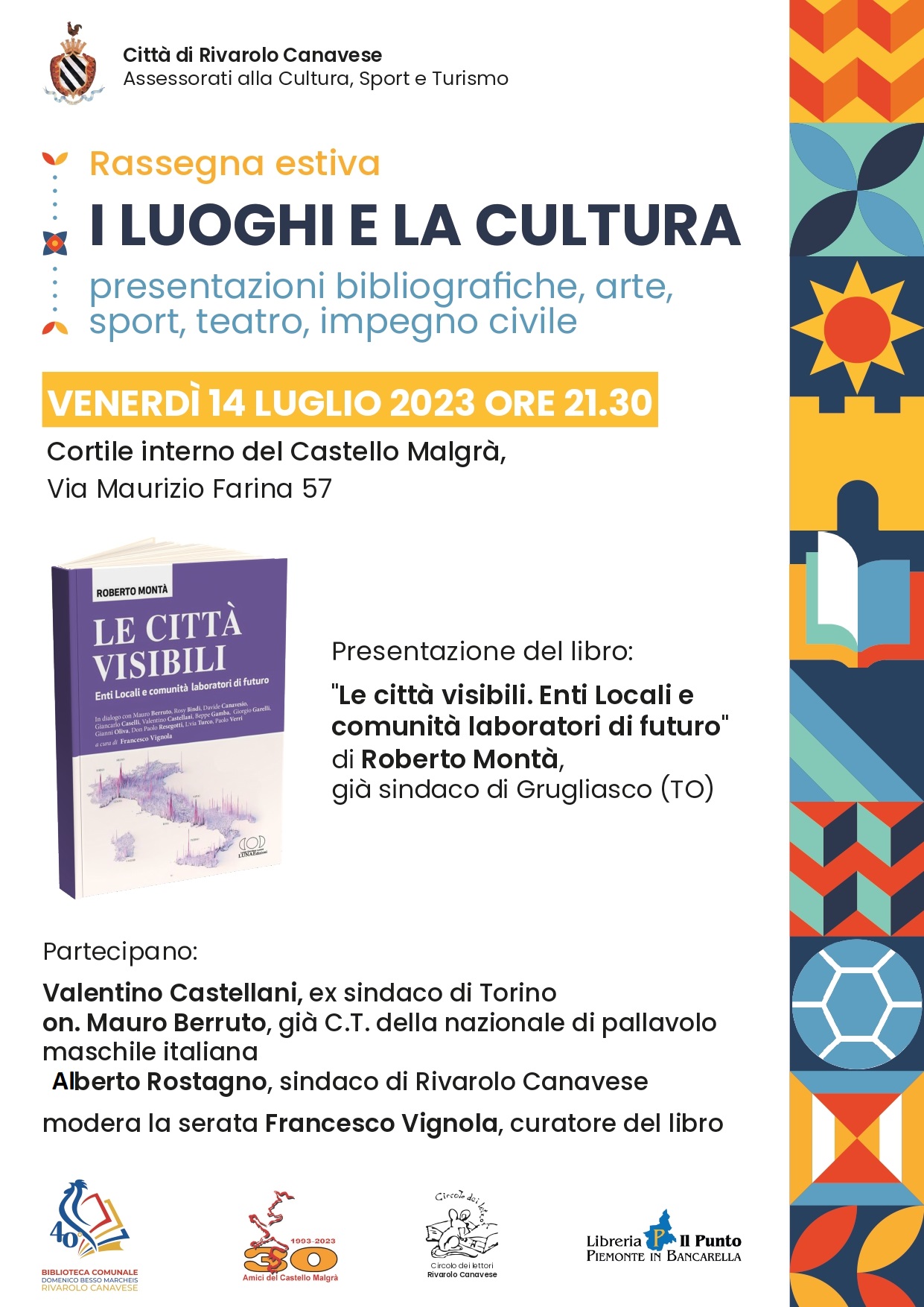 Venerdì 14 luglio alle 21.30 al Castello Malgrà, Roberto Montà, ex sindaco di Grugliasco, presenta “Le città visibili. Enti Locali e comunità laboratori di futuro” (Lunaedizioni). Intervengono l’on. Mauro Berruto, commissario tecnico della nazionale di pallavolo maschile italiana dal 2010 al 2015 e il sindaco di Rivarolo, Alberto Rostagno. Modera la serata Francesco Vignola.
