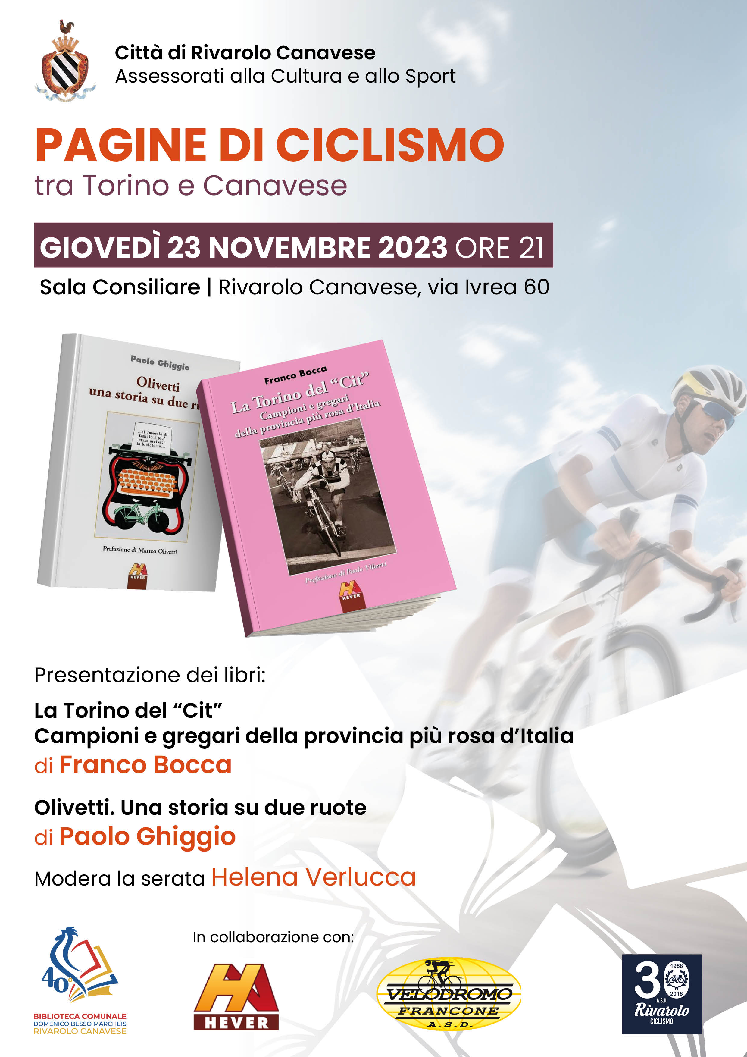 Giovedì 23 novembre, alle ore 21 presso la sala consiliare in via Ivrea 60, doppia presentazione a cura di Helena Verlucca con La Torino del “Cit” di Franco Bocca, saggio dedicato a campioni e gregari della provincia più rosa d’Italia e Olivetti. Una storia su due ruote di Paolo Ghiggio.