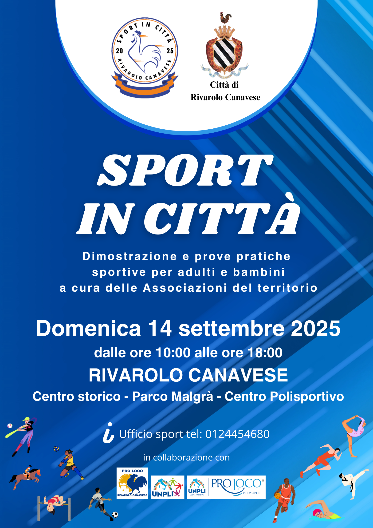 Domenica 14 settembre, dalle ore 10 alle ore 18, seconda edizione di Sport in Città, giornata, organizzata dal Comune di Rivarolo Canavese con l’adesione di numerose associazioni sportive e ricreative di Rivarolo e dei Comuni limitrofi, sarà l’occasione per favorire i valori dell’inclusione, del benessere e dell’appartenenza alla comunità.